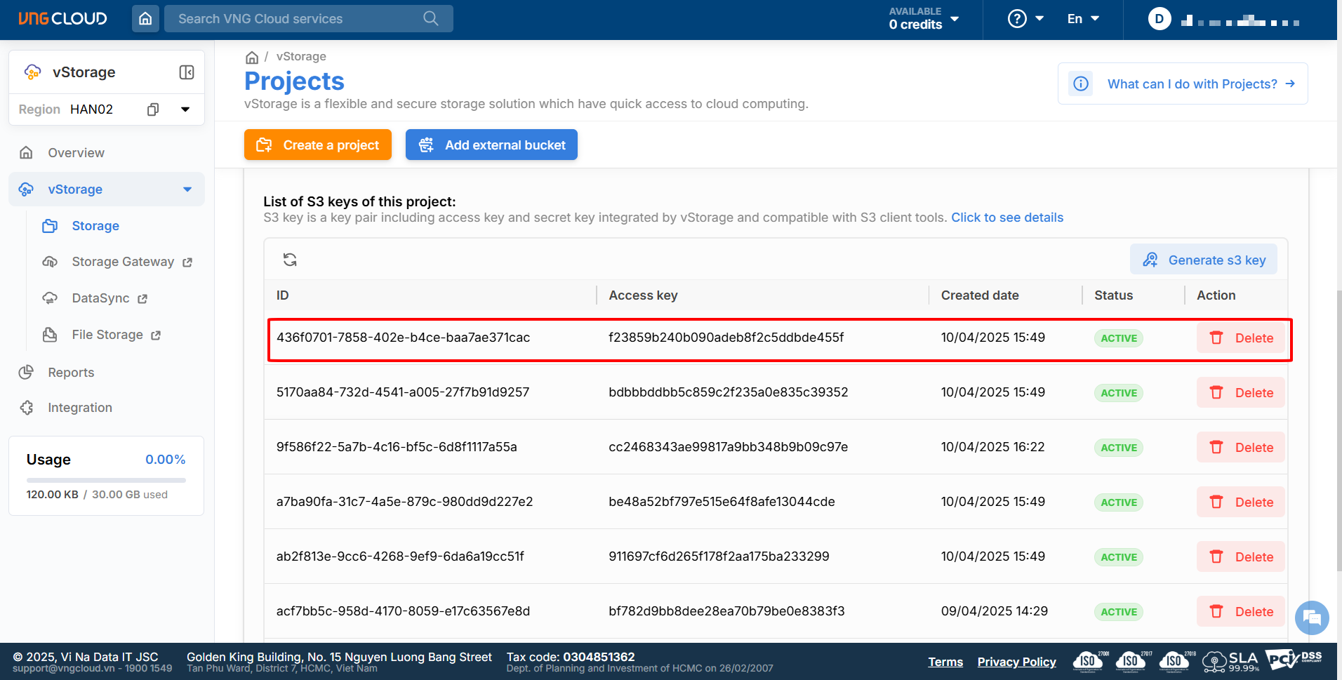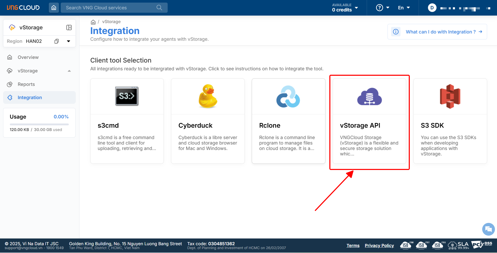 * Endpoint: [https://han02.vstorage.vngcloud.vn](https://han02.vstorage.vngcloud.vn/)