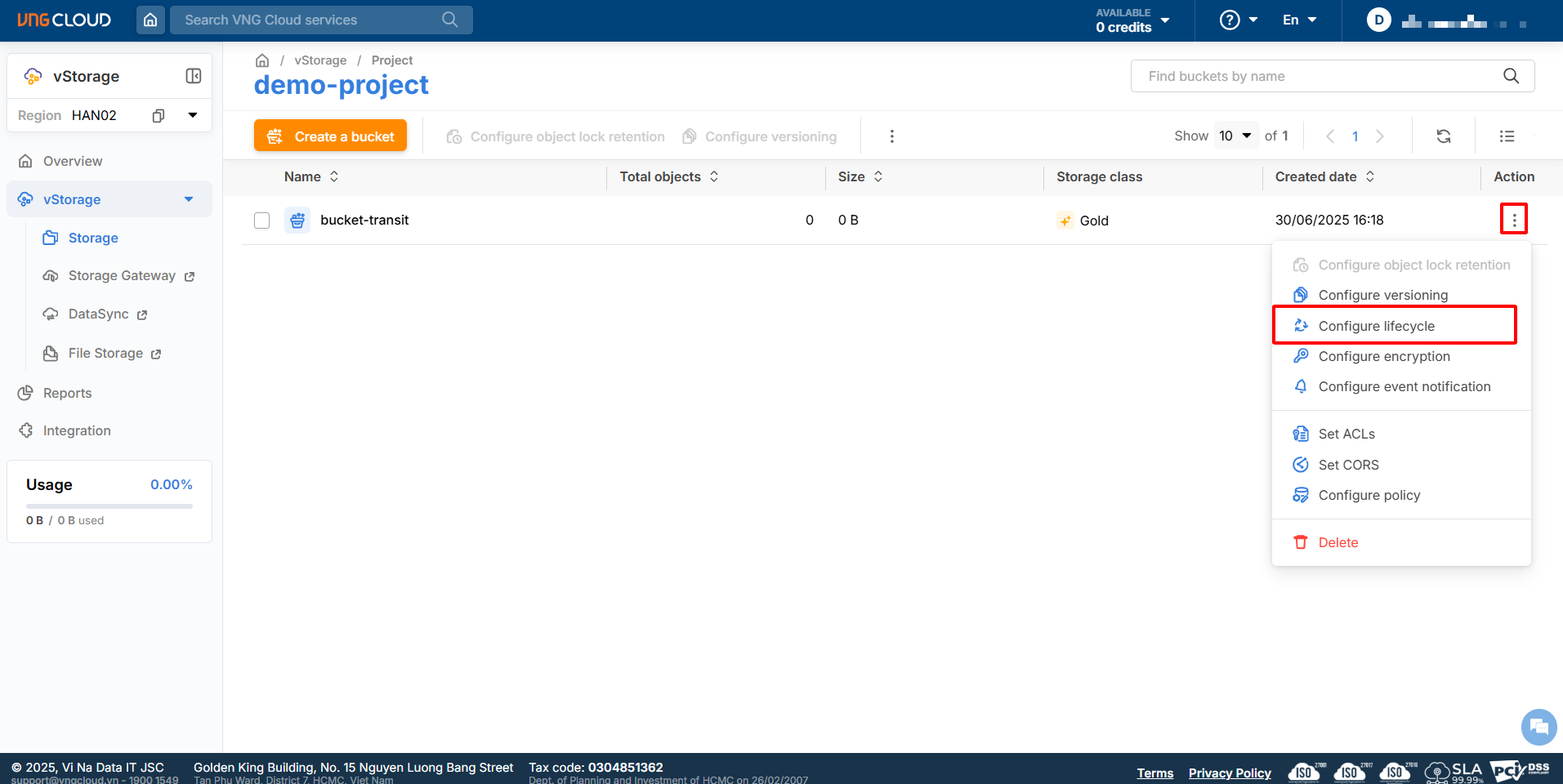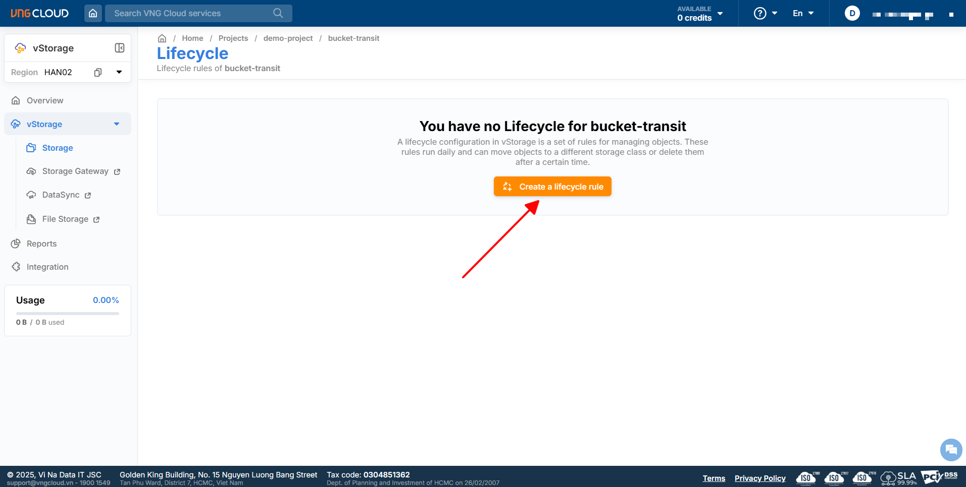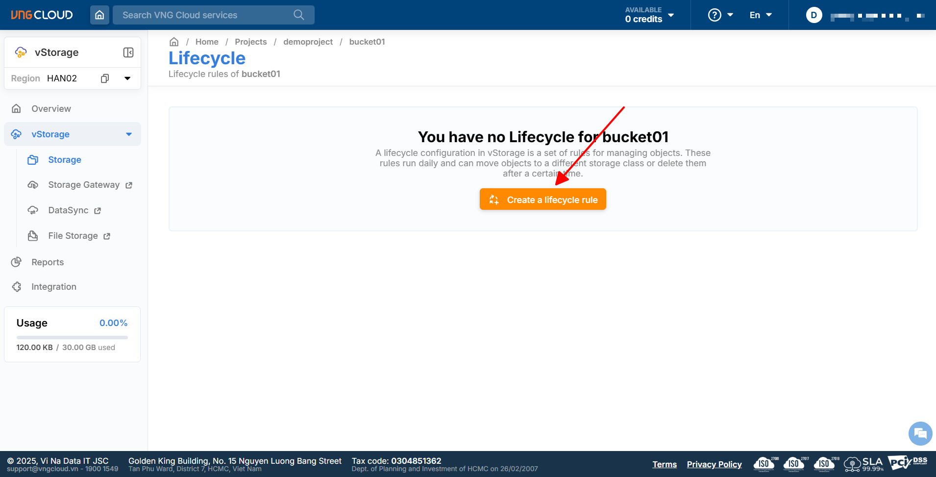 1\. Log in to [https://vstorage.console.vngcloud.vn](https://vstorage.console.vngcloud.vn/storage/list), then select Region **HAN02**