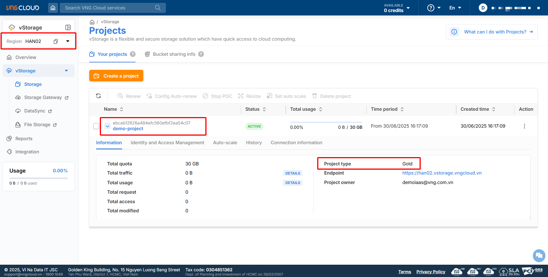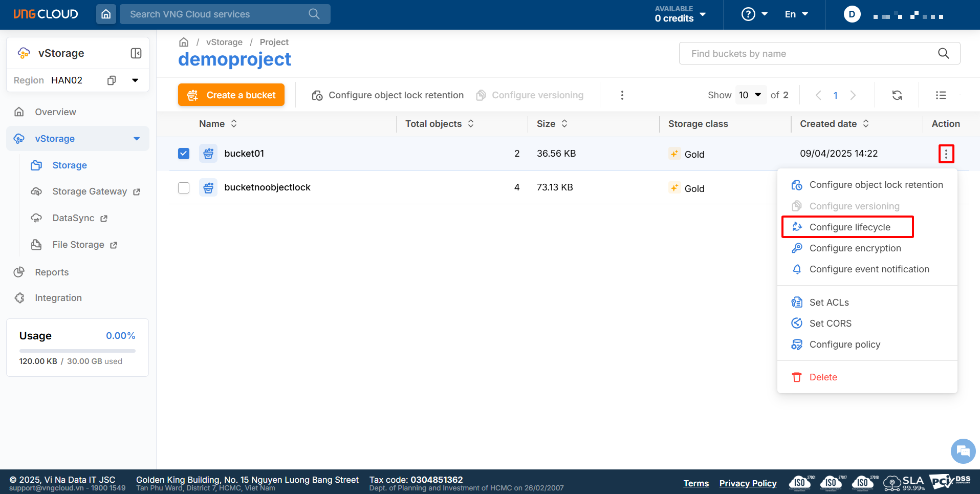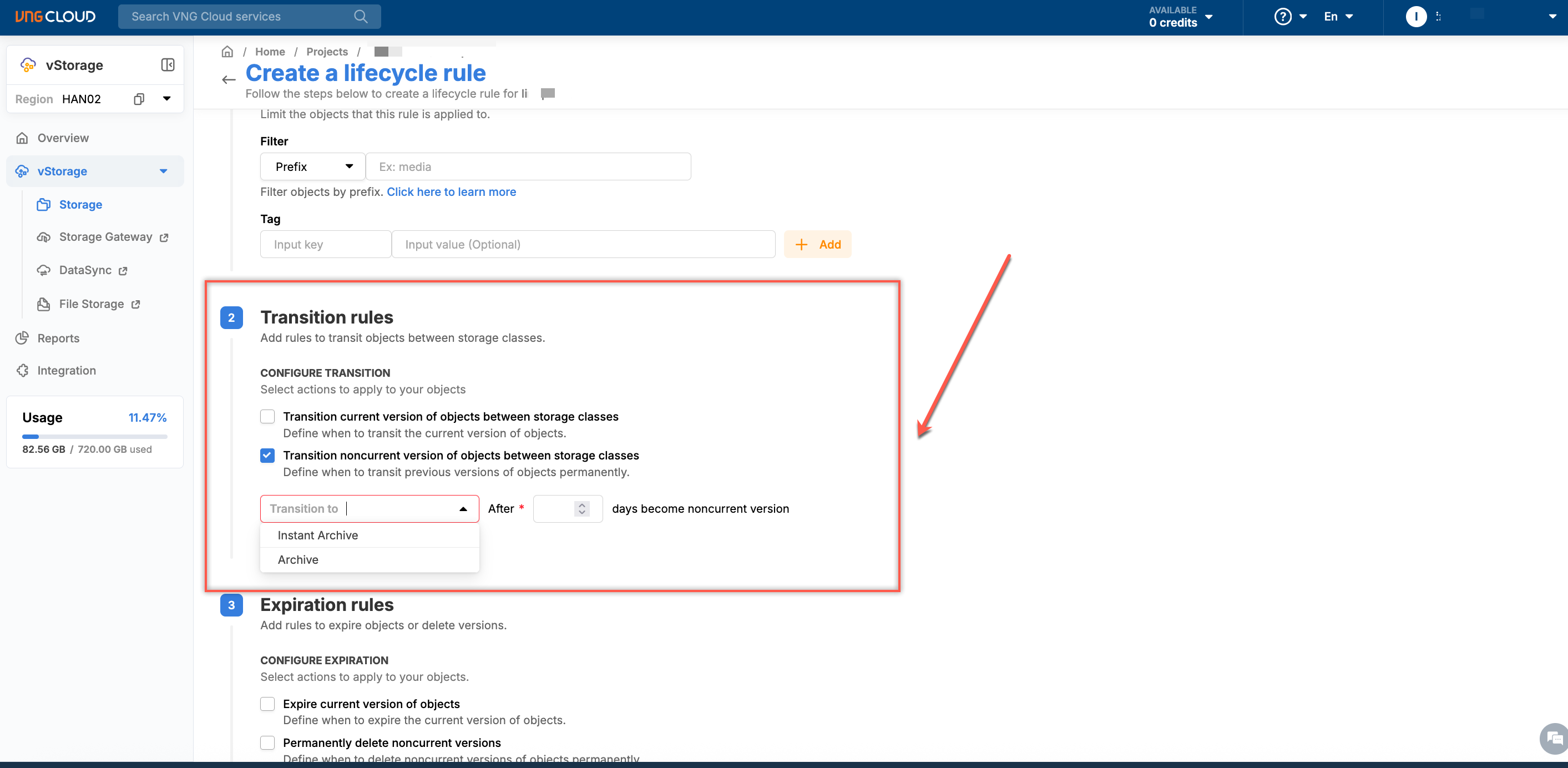 1\. Log in to [https://vstorage.console.vngcloud.vn](https://vstorage.console.vngcloud.vn/storage/list), then select Region **HAN02**