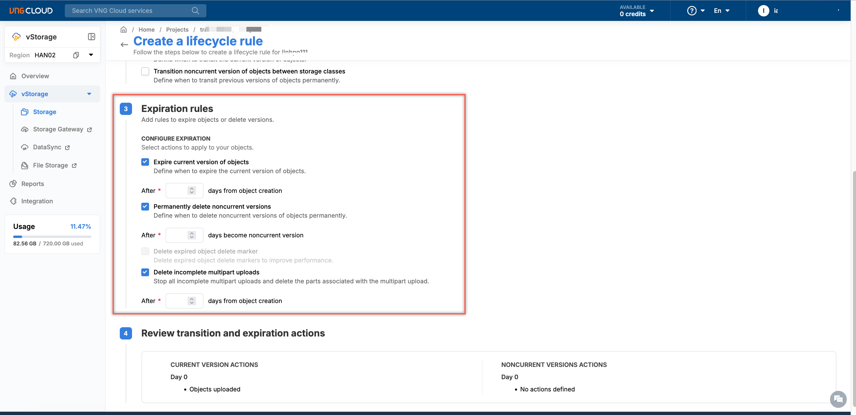 * You can enter a number of days in the "After \_\_\_ days from object creation" section to specify the period of time before incomplete parts of a multipart upload are deleted.