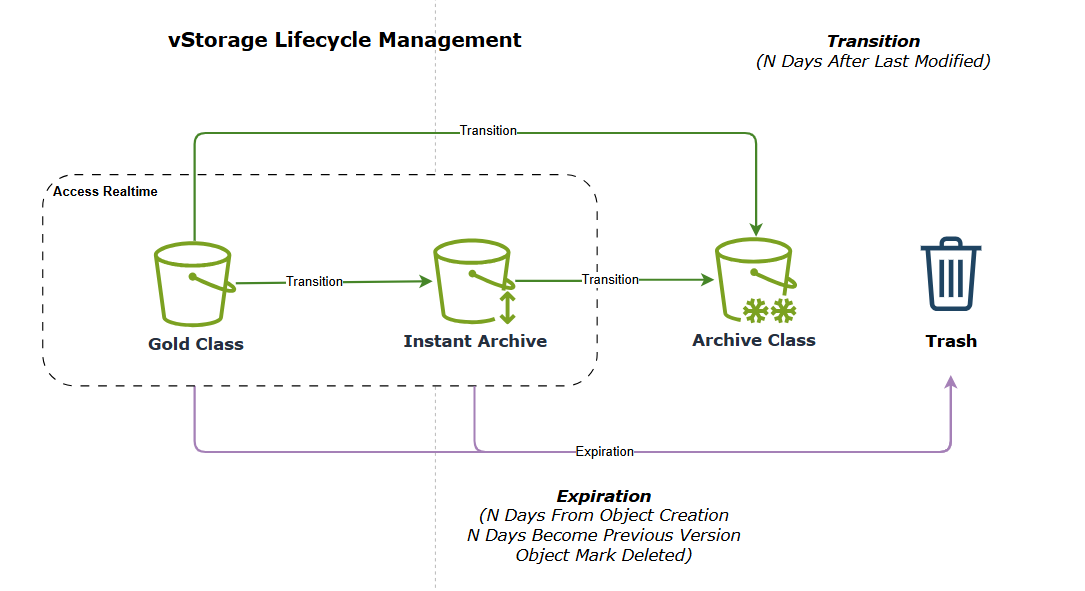 **Lifecycle** on vStorage is a feature that helps you manage the lifecycle of objects in your bucket, thereby optimizing storage costs. With Lifecycle, you can configure rules in 2 types: