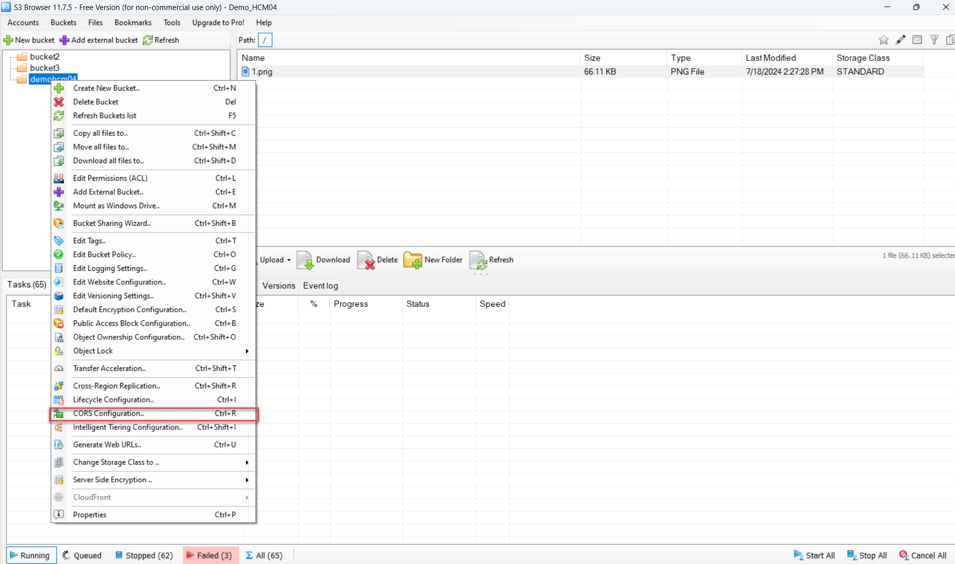 To set up CORS for a bucket using S3 Browser, right-click on the bucket, then select **CORS Configuration** . For more details, see <https://s3browser.com/s3-bucket-cors-configuration.aspx>