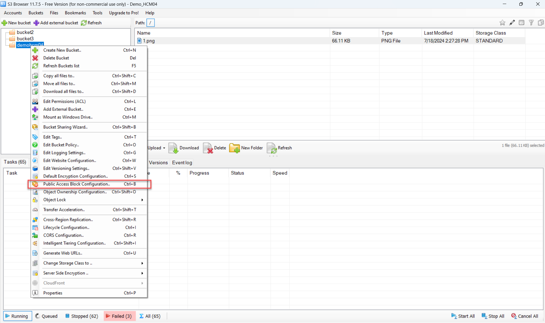 To set a bucket to public using S3 Browser, right-click on the bucket, then select **Public Access block Configuration** . For more details, see <https://s3browser.com/amazon-s3-public-access-block-configuration.aspx>