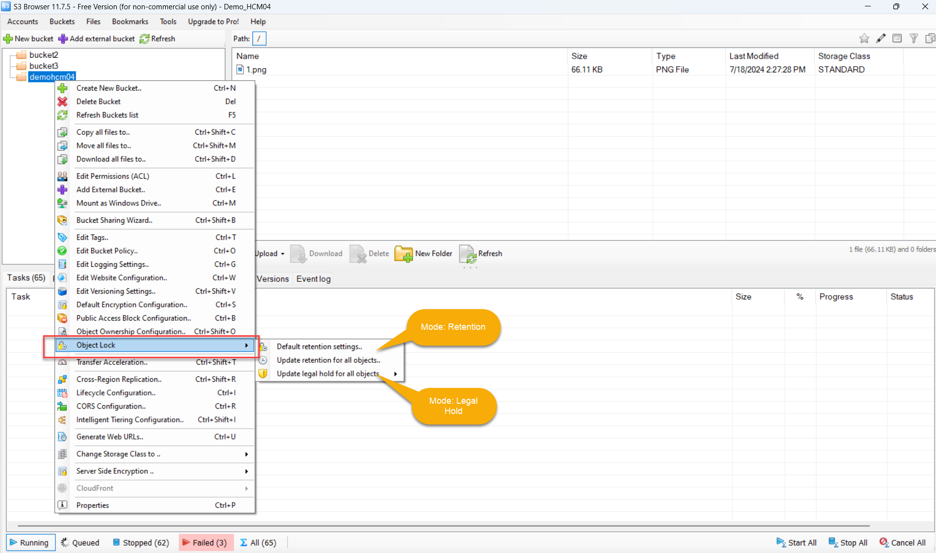 Next, when the bucket is successfully created, right-click on the bucket, then select **Object Locked** . You can set the object locked in both **Retention** and **Legal Hold** modes through S3 Browser. For more details, please visit <https://s3browser.com/amazon-s3-object-lock.aspx>