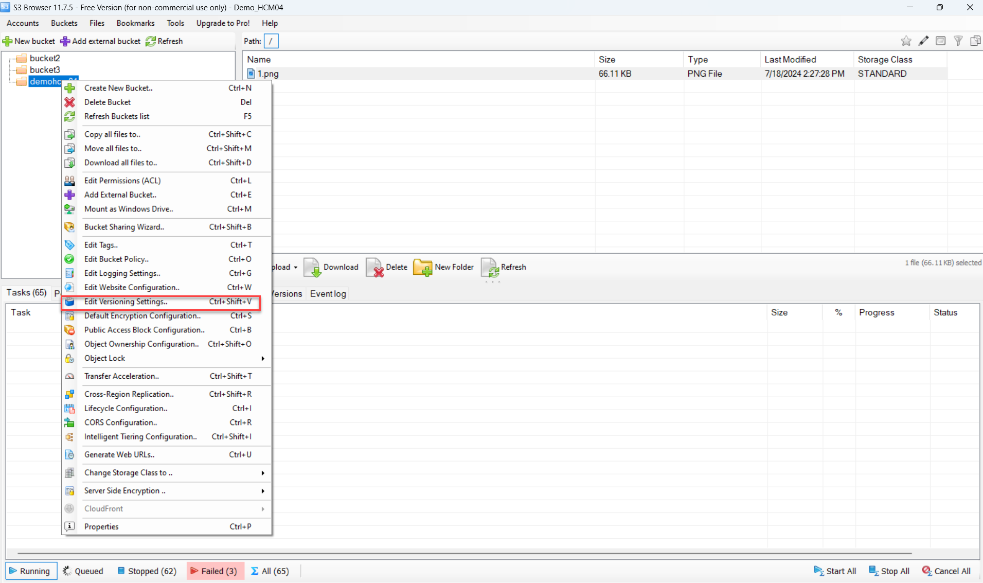 To set up Versioning for a bucket using S3 Browser, right-click on the bucket, then select **Edit Versioning Settings** . For more details, see <https://s3browser.com/amazon-s3-versioning.aspx>