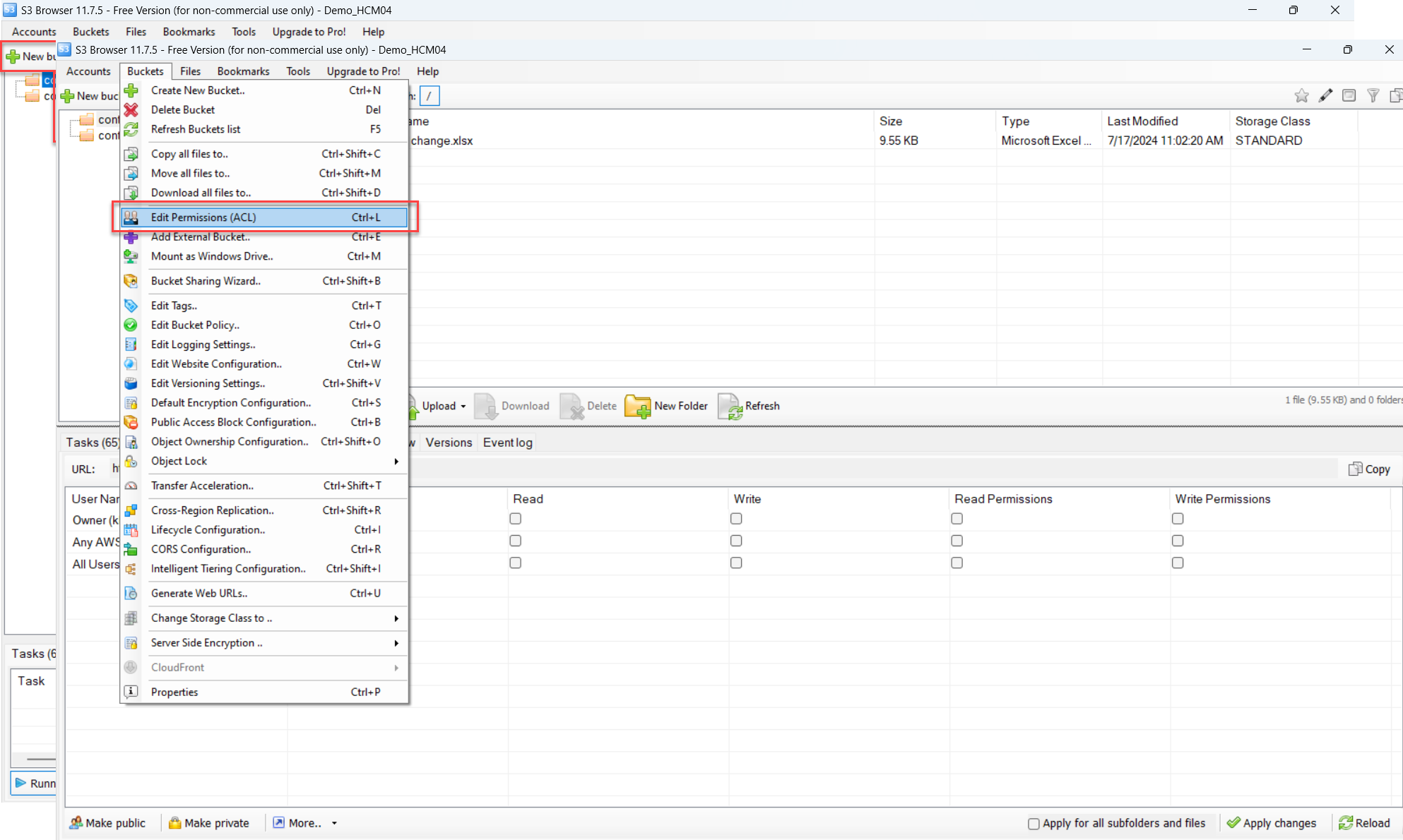 To set up ACL for a bucket using S3 Browser, right-click on the bucket, then select Edit Permission (ACL). In the permission section, check the permissions you want to grant to the user. For more details, see <https://s3browser.com/share-s3-bucket-edit-acls.aspx>