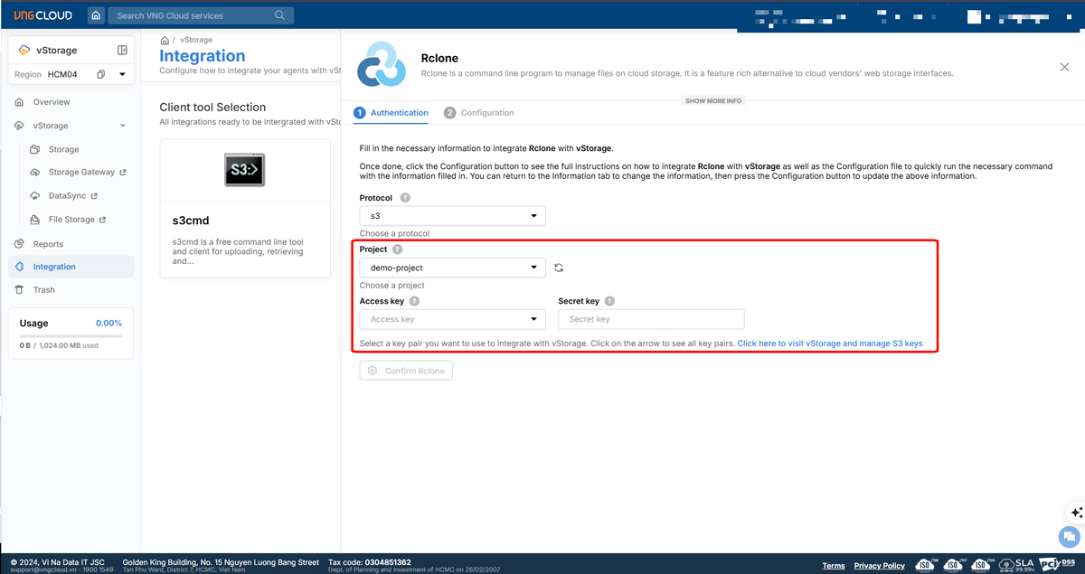 3. Enter the corresponding **Secret key** of the selected **Access key . The access key and secret key pair are created and managed by you through the vIAM system. You can select** [Click here to enter vIAM and manage s3 keys](https://iam.console.vngcloud.vn/vstorage-credentials/s3) so that we can navigate you to the vIAM system and the S3 keys management screens in detail. For more information about S3 keys, see [Initialize vStorage Credentials](https://docs-vngcloud-vn.translate.goog/vng-cloud-document/vn/vstorage/object-storage/vstorage-hcm03/quan-ly-truy-cap/quan-ly-tai-khoan-truy-cap-vstorage/tai-khoan-service-account/khoi-tao-vstorage-credentials) .
