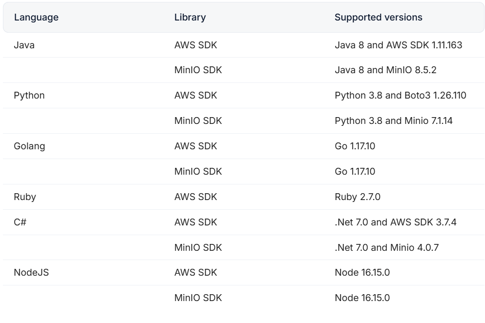 Below is a list of languages, libraries and their corresponding versions that we provide for you to integrate with vStorage: