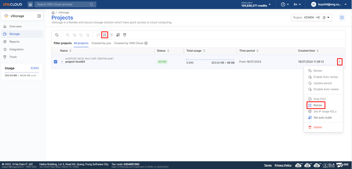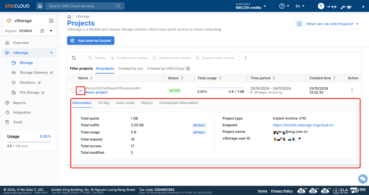 A Project is a term on vStorage that represents a storage package with a specific capacity that you purchase on GreenNode. With Region HCM04, at a time you can own up to 10 Projects and use them to organize your data storage.