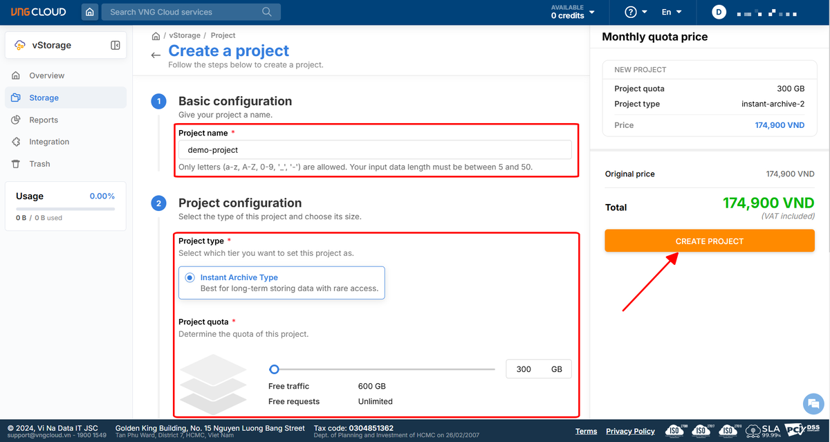 Enter Project Name and select the appropriate Project type (package) according to your needs. Currently in region HCM04, we will provide you with the Instant Archive Type package . With this package, you will have free Traffic equal to 2 times the Quota you choose to use and the Request amount is completely free. For more information on pricing, please refer to Pricing.