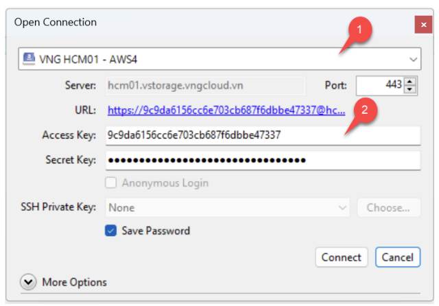 Access key: Enter the S3 access key you created from vIAM, which is also the access key information obtained from step 4 above.