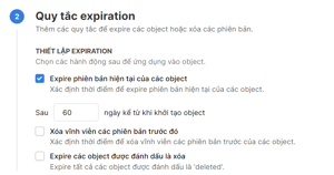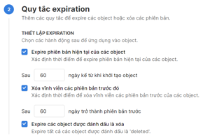 | <p><strong>Expiration rule will delete objects in the container based on certain conditions. Currently, the expiration feature supports:</strong></p><ul><li><strong>Deleting objects for both pre-paid and post-paid customer accounts.</strong></li><li><strong>Deleting objects in Gold, Silver, and Archive containers. (For Archive containers, the minimum number of days to perform object deletion is 180 days).</strong></li></ul><p>8. Select the action that occurs with objects in the chosen container, including:</p><ul><li><strong>Expire current versions of objects</strong>: Use when you want to set up the deletion of objects in the original container based on a period of time from the date the object exists in the vStorage system. This rule applies to deleting objects in non-versioning containers. When you choose this setting, you need to enter the number of days from the object's initialization.</li><li><strong>Permanently delete previous versions:</strong> Use when you want to set up the deletion of objects in the corresponding version container of the original container based on a period of time from when the versioned object was created. This rule applies to deleting objects in versioned containers. When you choose this setting, you need to enter the number of days from when the object becomes an old version (meaning the object exists in the versioned container).</li><li><strong>Expire marked-deleted objects:</strong> Use when you want to set up the deletion of files marked as deleted generated in versioned containers. (Delete marked files are files generated when you delete an object in the original container that has versioning enabled). This rule applies to deleting objects in versioned containers.</li></ul><p>After you successfully create a new Lifecycle rule with expiration type, within 2 hours from the time the lifecycle rule is created, the vStorage system will run the rule, objects that satisfy the conditions will be deleted.</p><p><em><strong>Refer to the 2 examples below to understand how the expiration rule works:</strong></em></p><p><em><strong>Example 1</strong></em>: <em>you have created container01 (container01 has not enabled container versioning yet). Now you need to set up a rule according to the rule: if the objects are not accessed for 60 days, the system will delete them. Now you will set up expiration rules as follows:</em></p><p><img src="https://1985221522-files.gitbook.io/~/files/v0/b/gitbook-x-prod.appspot.com/o/spaces%2F7rE7M1L7GYcwQzNGd0aB%2Fuploads%2Fgit-blob-37abc07de25bfd7a8db25fbd3ad817f18defabf2%2Fimage.png?alt=media" alt=""></p><p><em>Within 2 hours from the time this lifecycle rule is created, the vStorage system will run the rule, check the objects in container01 and delete objects that meet the 60-day inaccessible condition.</em></p><p><em><strong>Example 2:</strong></em> <em>you have created container01 (container01 has container versioning enabled). Now you need to set up a rule according to the rule: if the objects are not accessed for 60 days, the system will delete them. Now you will set up expiration rules as follows:</em></p><p><img src="https://1985221522-files.gitbook.io/~/files/v0/b/gitbook-x-prod.appspot.com/o/spaces%2F7rE7M1L7GYcwQzNGd0aB%2Fuploads%2Fgit-blob-8f796316e8a98b74fb81fe0bc7f318fadb26c6b0%2Fimage.png?alt=media" alt=""></p><p><em>Within 2 hours from the time this lifecycle rule is created, the vStorage system will run the rule, check the objects in container01, container01\_version and do:</em></p><ul><li><em>Delete objects belonging to container01 that satisfy the 60-day inaccessibility condition.</em></li><li><em>Delete objects belonging to container01\_version that satisfy the 60-day condition to become the old version (ie the object exists in container01\_version for 60 days).</em></li><li><em>Delete the delete marker files generated in container01\_version.</em></li></ul> |